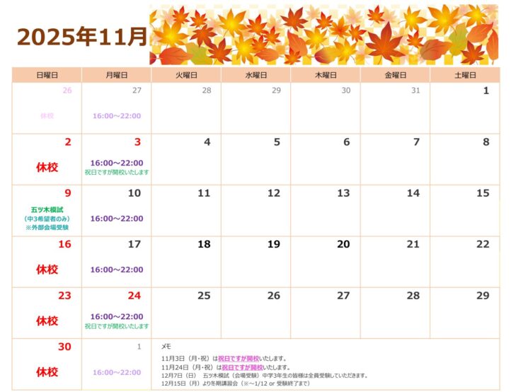長期休暇には、講習があり、2泊3日の勉強合宿を実施。